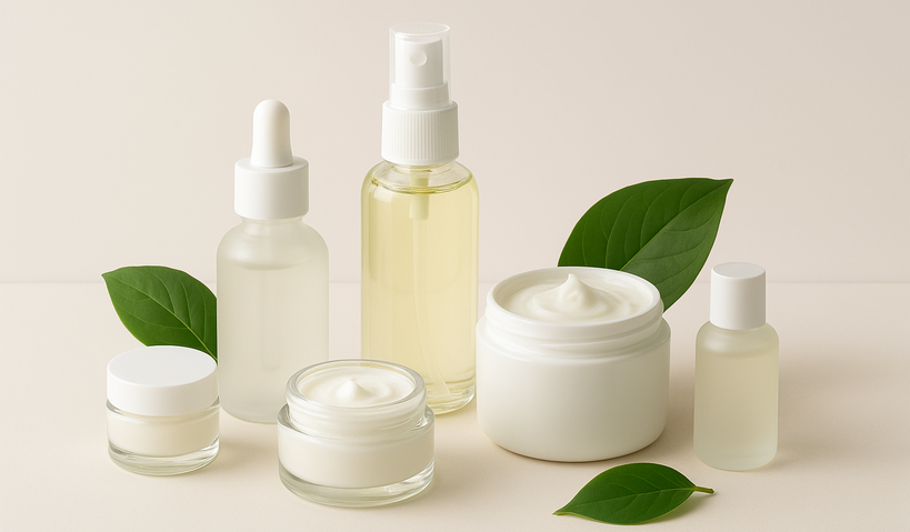 A beautifully arranged display of health and beauty products featuring natural skincare essentials — including serums, creams, and oils — set against a clean, minimalist background. The composition highlights soft tones, fresh green leaves, and elegant packaging that reflect purity, wellness, and modern self-care.